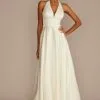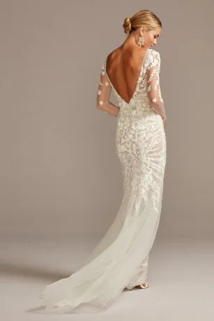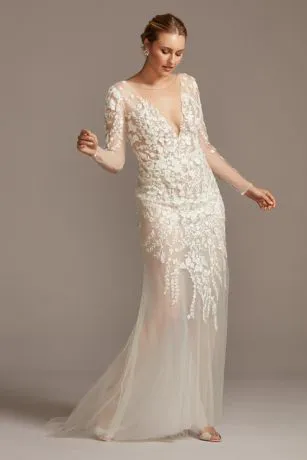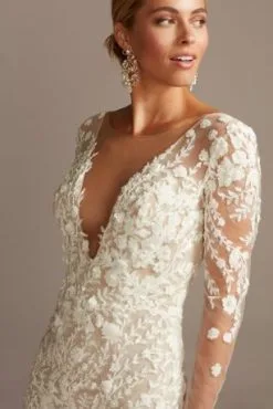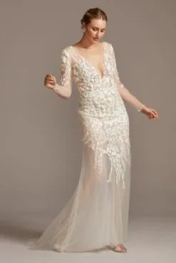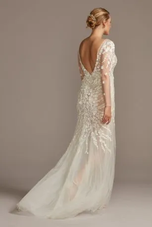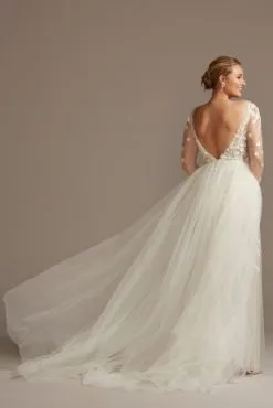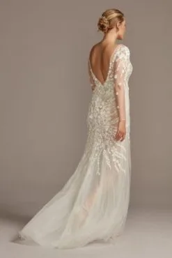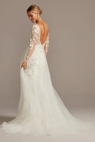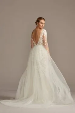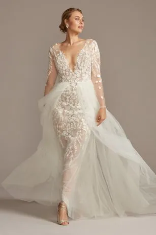 Bold and beautiful, this wedding dress creates an incredibly alluring wedding day look. Beaded floral blooms and branches embellish a sheer, plunging-V overlay and a sleek power mesh bodysuit, which provides both a high-fashion nude illusion and a secure, sexy way to contour the body. The removable tulle overskirt, which can be worn to add coverage for the ceremony, adds dramatic-yet-dreamy dimension to the intricately embellished sheer illusion skirt beneath.