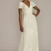 Ornate lace and floral applique is layered atop illusion mesh and tulle to form this modern heirloom wedding dress. The vintage-inspired appliques create a high mock neckline, while eyelash-trimmed scallops adorn the cap sleeves and A-line skirt. Finished with a chapel train.