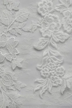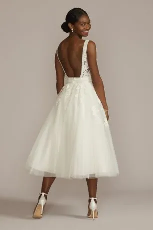 Detailed with luxe embroidered appliques and three types of lace, this elegant glitter tulle wedding dress is a dream for boho and romantic brides. Crochet trim along the V-neckline, open back, and waist adds a dainty finish to the illusion-accented bodice and beautifully contrasts the dramatic tea-length skirt.