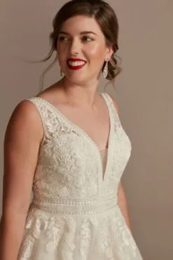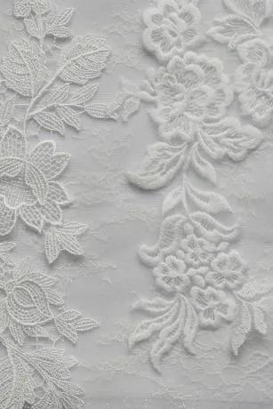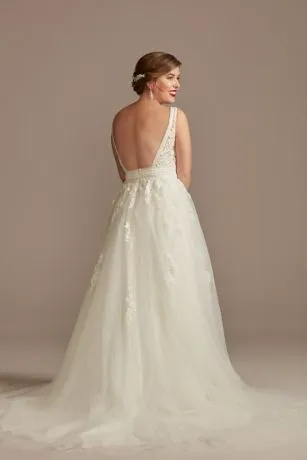 Detailed with luxe embroidered appliques and three different types of lace, this elegant glitter tulle long sleeve wedding dress will be the dream dress of boho and romantic brides alike. Crochet trim along the V-neckline, open back, and waist adds a dainty finish to the illusion-accented bodice and beautifully contrasts the dramatic skirt.