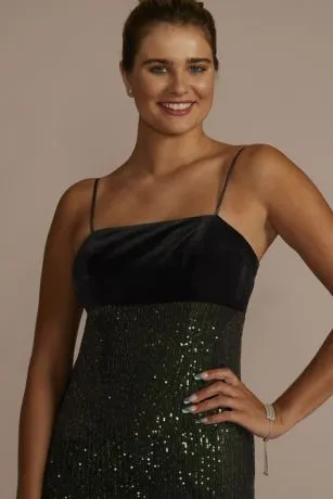 This mixed materials midi dress gives you the best of both worlds with soft velvet on top and a sequin-embellished skirt on bottom. An empire waist feels fresh on this silhouette, thanks to the straight neckline and thin spaghetti straps. Pair with your best heels and accessories and head to GNO or your next special occasion!