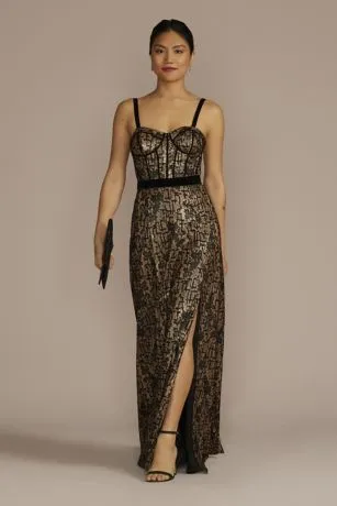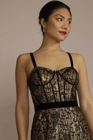 With a light-catching metallic sheen over novelty fabric, velvet trimmed accents, and a corset bodice, this sheath dress guarantees the title of Best Dressed. Go all out glam in your favorite heels the skirt slit was made for showing them off.