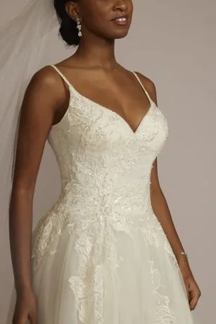 Over 1600 beads are placed by hand to create the sparkly bodice on this wedding dress. A full tulle skirt flows from the drop waist into a gorgeous chapel train, decorated with elegant floral appliques.