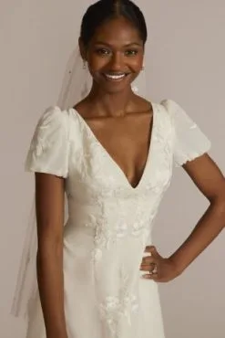 Your search for the perfect boho wedding dress is over! From the flowing skirt and puff sleeves to the allover floral appliques, each intricate detail of this V-neck, empire waist wedding gown is a call to nature and its unmatched beauty.