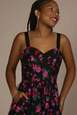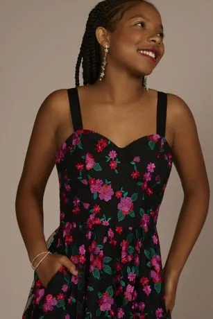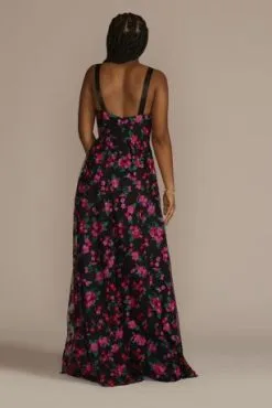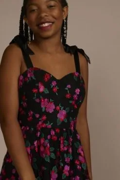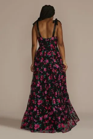 A pretty floral pattern covers this romantic A-line dress perfect for prom or evening occasions. Attach removable dreamy bows to the satin straps for an ultra-feminine feel.