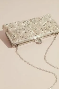 The most romantic way to carry your big-day essentials, this crystal-encrusted clutch features beaded swirls and floral motifs fit for a duchess. A smooth satin back ensures your dress won’t snag.