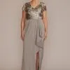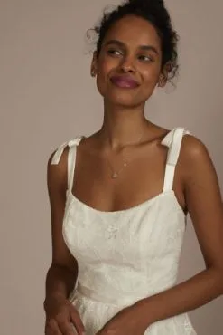 Chat, dance, and twirl the night away in this mid-length floral lace dress, complete with handy pockets. Silky charmeuse straps meet at the shoulder in non-adjustable decorative bows and cinch the waist below.