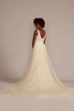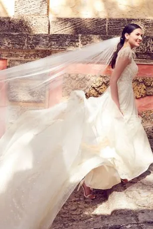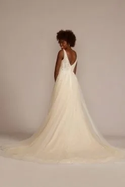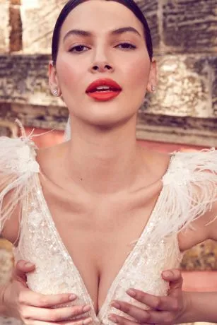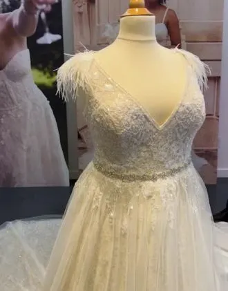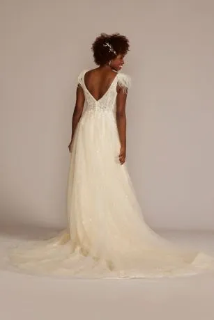 When glam is your middle name, this wedding dress checks all the boxes: shining sequin fabric, luxurious lace appliques, removable feathers, and an awe-inspiring 100-inch cathedral train.