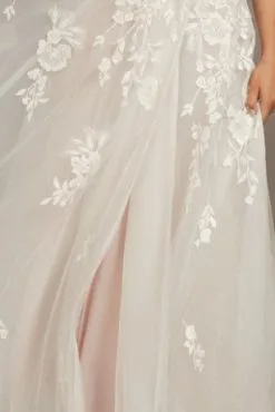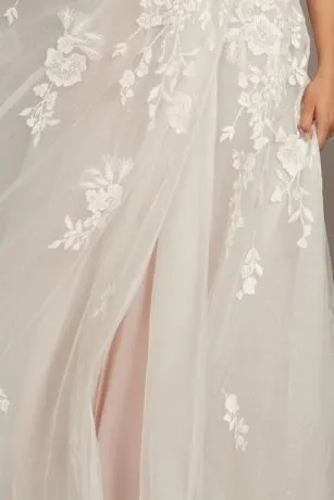 An A-line wedding dress gets romantic updates to create a beautifully unique, poetic wedding dress. With visible boning details that add silhouette-defining structure to the sheer sweetheart bodice and removable swag sleeves for an off-the-shoulder look, the gown is finished with embroidered floral appliques that cascade down the airy, tulle skirt. Glittery layers add sparkling dimension, and the look is finished with a hidden skirt slit.