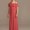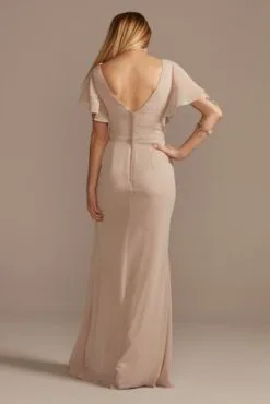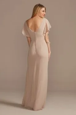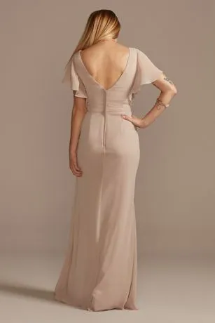 Soft flutter sleeves, a V-neckline, and a statement ruffle give this chiffon bridesmaid dress a modern boho feel.