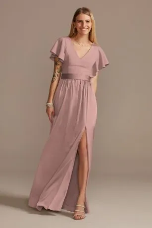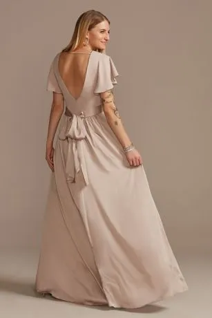 Crafted with a moss crepe bodice and a lustrous matte charmeuse skirt, this radiant bridesmaid dress will be adored by every bridesmaid. A high-shine sash adds a waist-cinching touch between the V-neck, flutter sleeve bodice and slit-accented skirt. Plus, it has an open back and pockets!