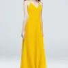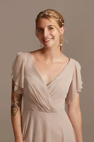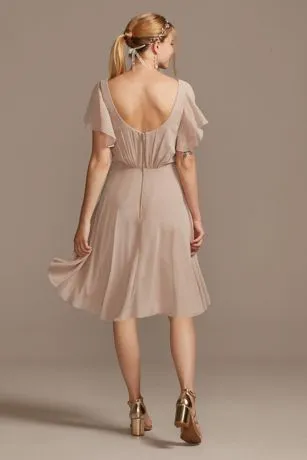 This below-the-knee bridesmaid dress gives an aura of dreamy romance from the softly pleated, plunging-V neckline to the soft, floaty skirt. The faux-wrap style bodice is finished with flutter sleeves.