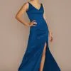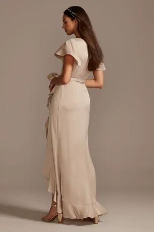 Crafted of crepe-back satin, this bridesmaid dress has a luminous shine from the flutter sleeves to the V-neckline to the ruffled skirt hem. A tie at the waist adds the finishing touch.