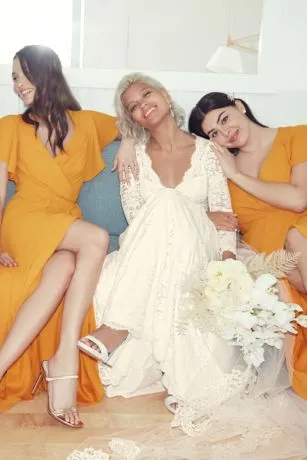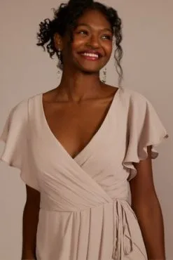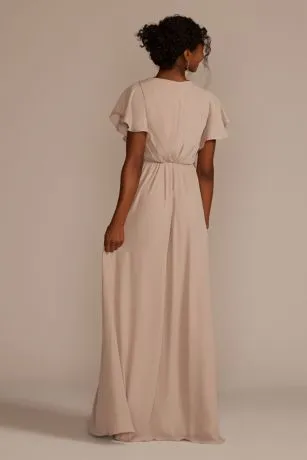 Flutter sleeves and elegant pleats wrap around the bodice of this soft georgette bridesmaid dress.