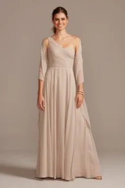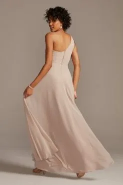 This long chiffon bridesmaid dress gives an aura of dreamy romance from the softly pleated, one-shoulder sweetheart neckline to the billowy, floating full circle skirt.