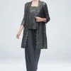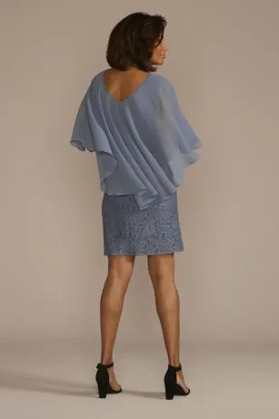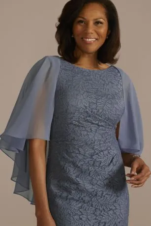 An elegant option for Mom’s upcoming special occasions, this gorgeous set features a glitter lace sheath dress, designed with a subtle slit and removable floating chiffon capelet.