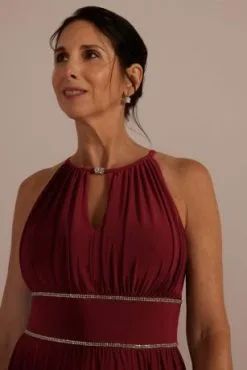 Soft jersey fabric sweeps from the keyhole halter neckline into a flowy A-line silhouette. A waistband detailed with dazzling sequins highlights your figure, while a skirt slit is perfect for showing off your favorite heels.