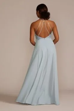 Ready to make a statement? This sexy bridesmaid dress is full of glam details including illusion halter straps, a plunging lace bodice with sequins, and a full georgette skirt with slit. Features side pockets.