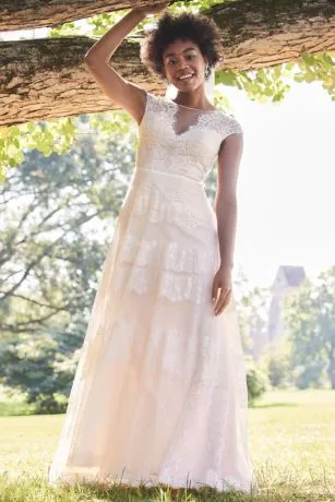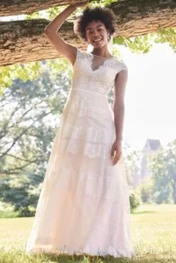 The high cut and delicate lace cap sleeves are a nod to the past, while the self-tie open back and keyhole neckline bring this lace gown to the now.