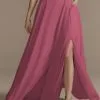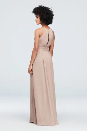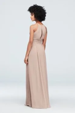 Graceful pleating and a keyhole neckline add extra elegance to this long chiffon bridesmaid dress. The ruched waistline provides figure-defining detail.