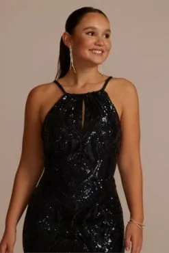 Curves and linear details formed by shining sequins create an alluring pattern on this glamorous sheath dress. The high neckline features a beaded trim, adding further intrigue to a keyhole bodice.