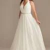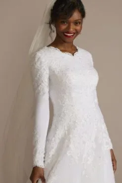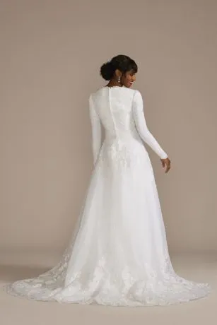 Princess dreams come true in a traditional ball gown wedding dress, particularly when it’s as lovely as this lace-appliqued tulle creation. Pearl and crystal beading gives a soft glow to the scalloped, high-neck bodice and full skirt, as classic buttons embellish the back. Lace-adorned long sleeves add modesty and romance.