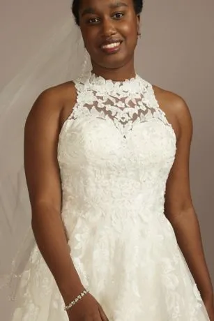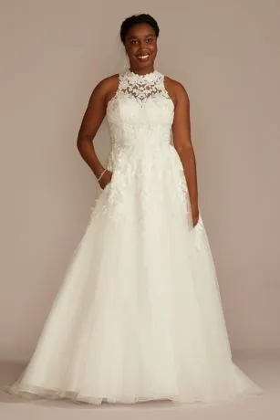 Perfect for the traditional bride who’s looking for something a little different, this A-line wedding dress features a high lace neckline and sheer lace back detailed with fabric-covered buttons. The layered tulle skirt is complete with a sweep train, ensuring graceful movement with every step.