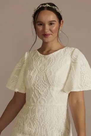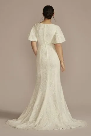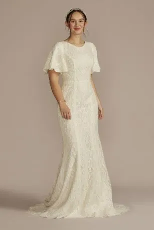 This allover lace embellished wedding gown features a high neckline and flutter sleeves for modesty, while also boasting a stunning scalloped edge trim and sweep train.