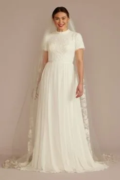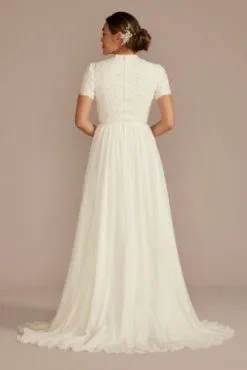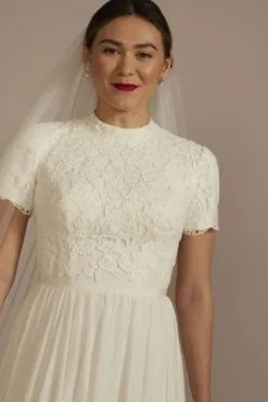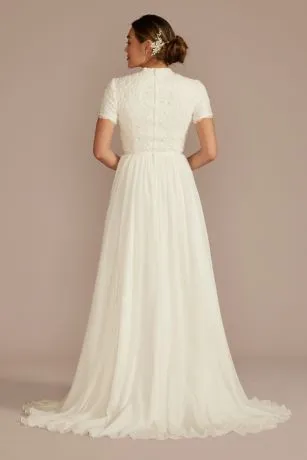 This high-neck wedding dress is the picture of effortless elegance. The lined lace detail at the high neckline adds a modest touch, while the chiffon skirt lends a flowy, romantic air.