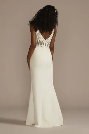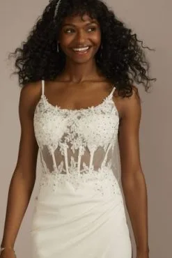 Dial up that bridal glow in a sheer bodice decorated in alluring lace. A wrap skirt caresses your curves while the slit detail highlights your legs (and the shoes)!