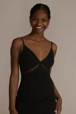 Risque details come with great rewards on this stretch crepe dress featuring tastefully revealing cutouts. Clean lines on the bodice and a skirt slit add interest to a classic sheath silhouette.