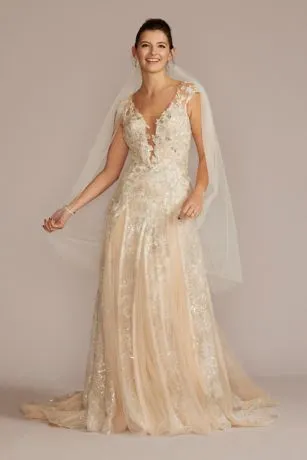What’s more eye-catching than a sequin fabric wedding gown? A sequin fabric wedding gown swathed in 14 beaded lace embellishments! Sexy details like a plunging V-neck and an illusion open back provide an alluring contrast to the floral appliques and skirt godets, giving you the ultimate confidence boost on your big day.