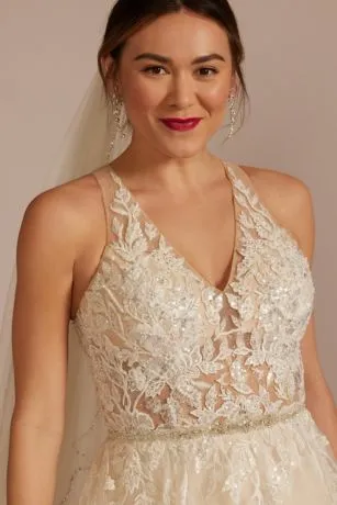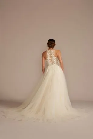 Every step down the aisle is a dream come true. Make it even dreamier in a voluminous tulle skirt with a chapel train that flows with you as you move. Showcase your sexy side with an illusion halter neckline covered in beaded lace, with a gorgeous beaded belt cinching your waist.