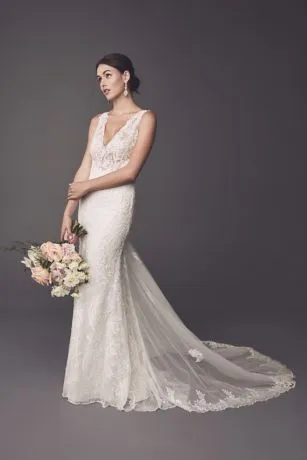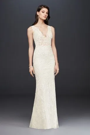 The plunging tank bodice of this slim sheath wedding dress is a dramatic show-stopper. Fully lined in beige illusion mesh, it creates a barely there backdrop that lets the beauty of beaded lace shine through. The scalloped back features illusion mesh, creating another dazzling focal point atop the lace-edged skirt.