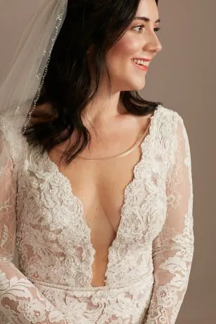 Soft floral lace layered with hand-sewn lace appliques and delicate beading, swoon! This romantic long-sleeve wedding dress is vintage-inspired and amplifies curves with an illusion plunge neckline and powermesh lining.