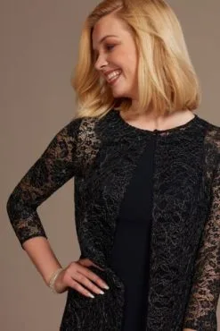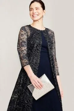 A textured metallic jacket with full sleeves overtop a crepe tank dress lends to a mesmerizing look. Perfect for day to night, or for a bit of extra coverage at your next event.