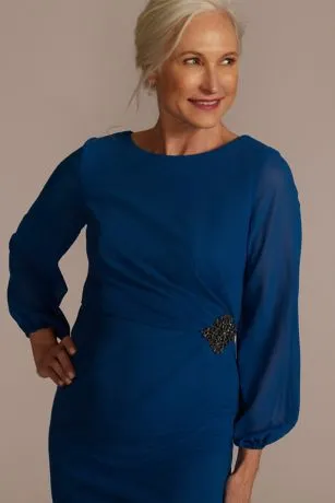 Sophisticated with a hint of sparkle, this knee-length dress is perfect for your next occasion. A hip embellishment and long sleeves elevate the look.
