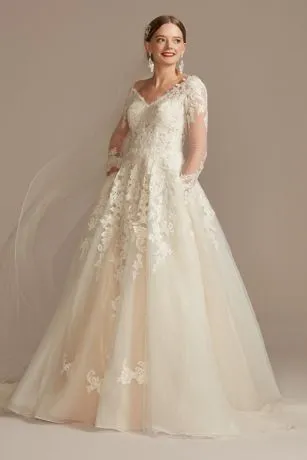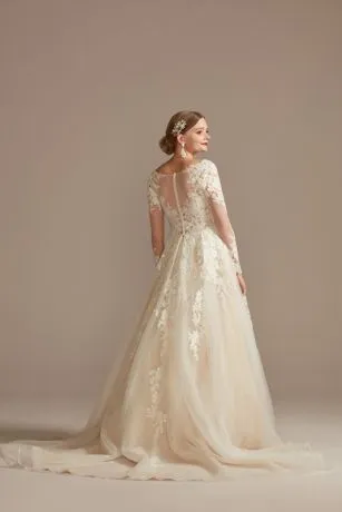 Delightfully alluring, the lace-appliqued, semi-sheer bodice of this airy tulle ball gown creates a delicate look for brides who take their romance with a side of daring. Long sleeves add just the right amount of coverage.