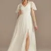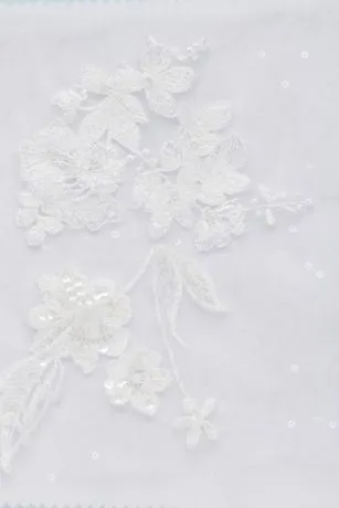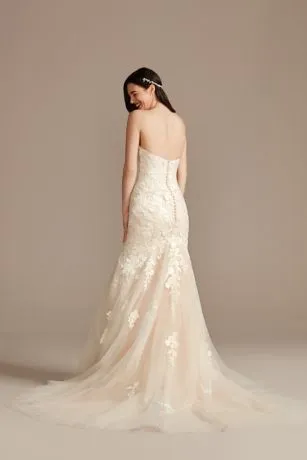 A stunning balance of romantic and alluring, this strapless wedding dress features a plunging sweetheart neckline and ornate lace appliques. Created with two layers of tulle, the mermaid skirt adds beautiful shape to the gown.