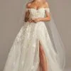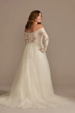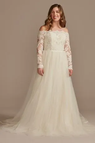 An off-the-shoulder bodice, with scalloped trim and appliques, is the focal point of this elegant long-sleeve A-line wedding dress. Tonal lining beneath the layered tulle skirt adds a warm touch to the romantic wedding-day look.