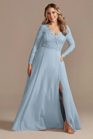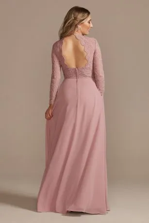 A romantic bridesmaid dress with a stretch lace long-sleeve bodice and open back. Features a beautifully full floor-length chiffon skirt with a slit and handy pockets.