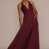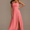 A glamorous side-drape detail, cowl neckline, and high skirt slit make this lace bridesmaid dress an extra alluring choice. Features bra cups.