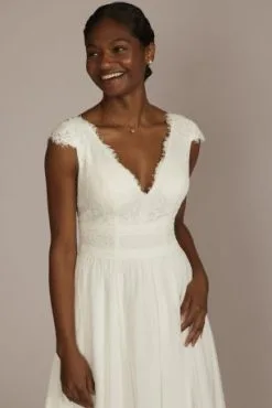 With a bodice of corded floral lace and a flowy tea length chiffon skirt, this cap sleeve V-neck wedding dress is the picture of effortless romance. Details like scalloped eyelash lace trim and an illusion back finished with buttons lend a dreamy air.