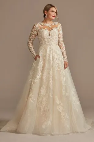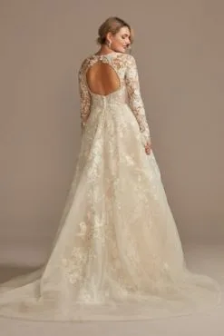 Luxurious beaded lace cascades over a shimmering metallic underlay on this majestic ball gown wedding dress. The open back is accented by delicate buttons, and the long sleeves are finished with floral appliques.
