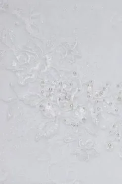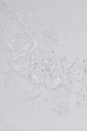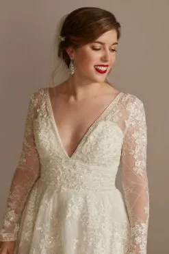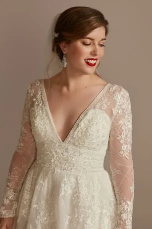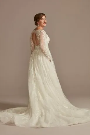 Fit for royalty, this elegant tulle ball gown wedding dress exudes luxury with its voluminous, structured skirt and waist-cinching silhouette. Delicate details like hand-beading, intricate appliques, and five different types of lace lend dimension to the opulence. A V-neckline and keyhole back, framed with illusion long sleeves, add a peek of skin to finish the look.