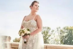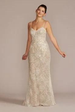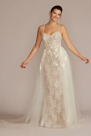 Make your guests do a double-take when you switch up your lace bridal look with a detachable embellished tulle overskirt. The enticing corset-like boning at the bodice enhances the sleek lines of the sheath silhouette, poised gently with the charming sweetheart neckline.