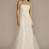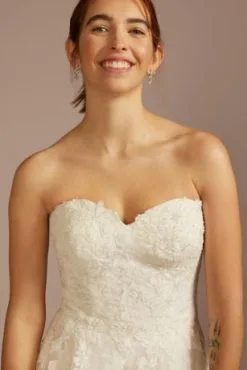 Every layer of this tulle A-line skirt is adorned with stunning lace appliques that trail the length of the chapel train below. The decorated sweetheart bodice is complete with a lace-up back and removable straps.