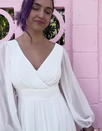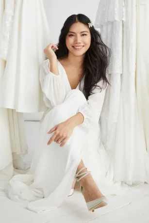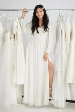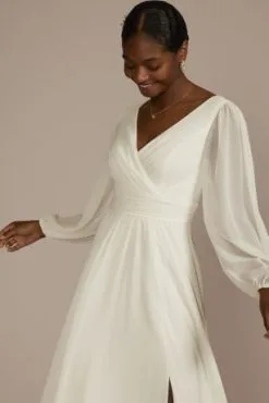 Long billowed sleeves make this dreamy A-line wedding dress different from all the rest. A pleated waistband and a surplice bodice add elegant shape, while the keyhole back lends a touch of drama.