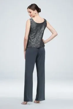 A long, sequined lace jacket, paired with a matching lace shell and wide-leg chiffon pants, creates an elegant silhouette for the mother of the bride or groom.