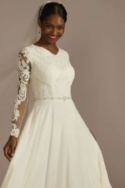 Lace embellishments and a high-neck, fully-lined bodice create a romantic, modest wedding gown. A cascading chiffon skirt, accented with a chapel train, adds flowy movement. Complete with shimmering moonstones and beadwork at the waist.